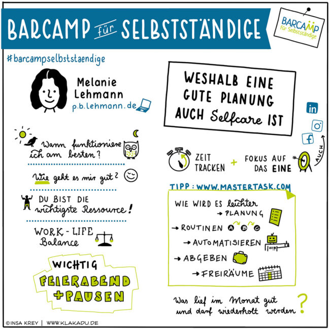 Sie suchen für eine (Online-) Veranstaltung eine Sketchnoterin? Ich fasse Inhalte in digitaler Form klar, übersichtlich und ansprechend zusammen, so dass Sie nach der Veranstaltung ein Handout an alle Teilnehmenden ausgeben oder auf Ihrer Webseite einen Ein- oder Rückblick geben können. Barcamp für Selbstständige Das Barcamp für Selbstständige wird organisiert von Martina Kohrn und Boris…