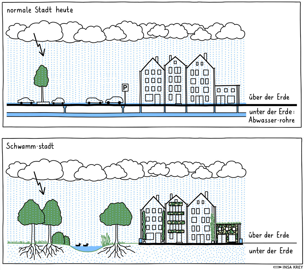 2 Zeichnungen. oben: normale Stadt heute bei viel Regen: Das Wasser geht in Abwasserrohre. Das kann bei Starkregen zu Überschwemmungen führen. Es gibt viele Parkplätze und einen Baum. Unten: Schwammstadt. Es gibt viele Bäume und Büsche, einen kleinen Teich und Pflanzen an den Fassaden der Häuser. Bei Starkregen geht das Wasser in den Teich und in den Boden.