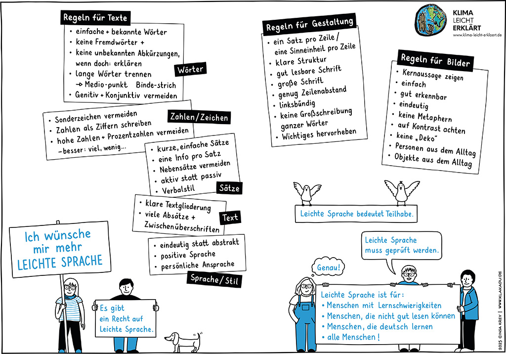 Erklärbild zu den Regeln der Leichten Sprache - Regeln für Texte, Wörter, Zahlen/Zeichen, Sätze, Sprache/Stil. Regeln für die Gestaltung und für Leichte Sprache Bilder.